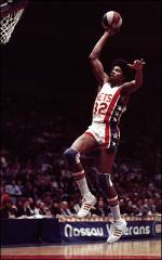 Julius "Dr. J" Erving is a retired American basketball player who helped launch a modern style of play that emphasizes leaping and play above the rim. Erving helped legitimize the American Basketball Association (ABA). He was the best known player in the ABA when the ABA-NBA merger joined it with the National Basketball Association (NBA) after the 1976 season. Erving won three championships, four Most Valuable Player Awards, and three scoring titles while playing with the ABA's Virginia Squires and New York Nets and the NBA's Philadelphia 76ers. He is the fifth-highest scorer in professional basketball history, with 30,026 points (NBA and ABA combined). He is well-known for slam dunking from the free throw line in Slam Dunk Contests. Erving was named to the NBA's 50th Anniversary All-Time team and in 1993 was inducted into the Basketball Hall of Fame. In 2004, he was inducted into the Nassau County Sports Hall of Fame. Many consider him among the most spectacular basketballers ever, and one of the best dunkers of all time. His signature dunk was the "slam" dunk, since incorporated into the vernacular and basic skill set of the game, in the same manner as the "cross-over" dribble and the "no look" pass. ~ Wikipedia. |